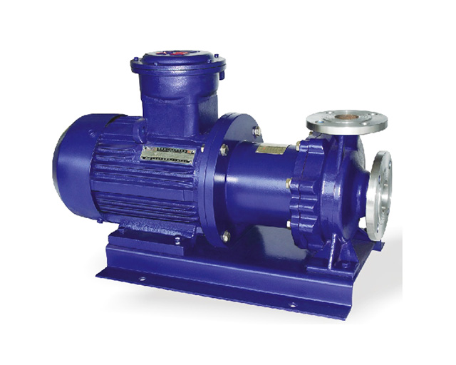 磁力離心泵通常由電動(dòng)機(jī),磁力耦合器和耐腐蝕離心泵組成。其主要特點(diǎn)是利用磁力耦合器的外磁鋼旋轉(zhuǎn)時(shí),磁力線穿過間隙和隔離套,作用于內(nèi)磁鋼上,使泵轉(zhuǎn)子與電動(dòng)機(jī)同步旋轉(zhuǎn),無機(jī)械接觸地傳遞扭矩。在泵軸的動(dòng)力輸入端,由于液體被封閉在靜止的隔離套內(nèi),沒有動(dòng)密封因而完全無泄漏。