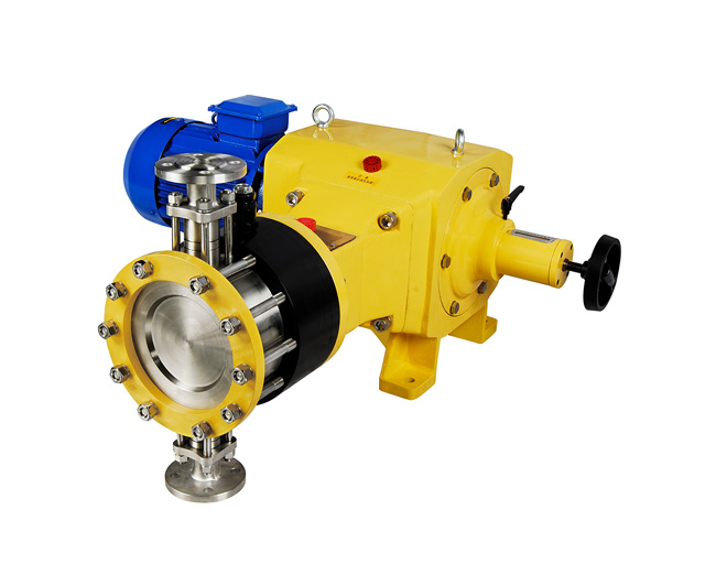 泵的液力端和隔膜組成工作腔,由活塞驅(qū)動(dòng)的液壓油均勻作用于隔膜做周期性變形、從而驅(qū)動(dòng)隔膜做往復(fù)運(yùn)動(dòng)的可調(diào)節(jié)流量的容積泵叫液壓隔膜計(jì)量泵。